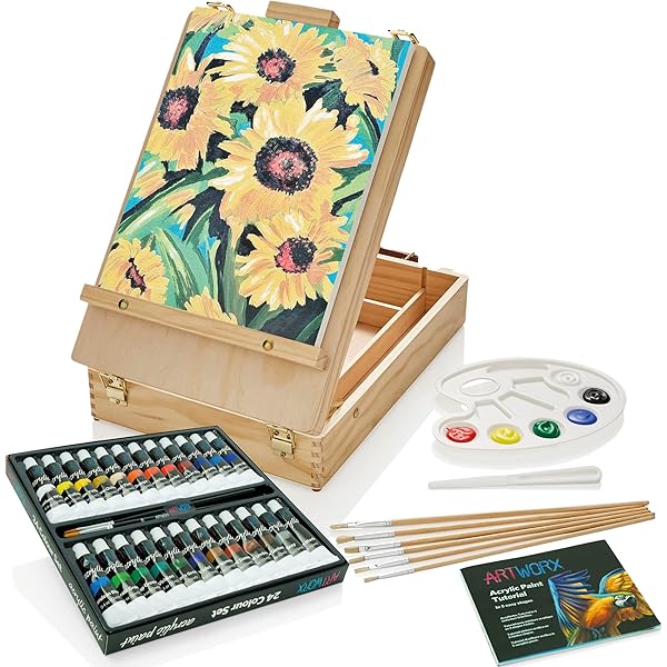 Acrylic Paint Set For Artists With Box Wood Easel 24 Tubes Of Acrylic Paints 6 Paintbrushes Blank Canvas Spatula And Mixing Palette Portable Travel Kit Amazon Co Uk Home Kitchen
